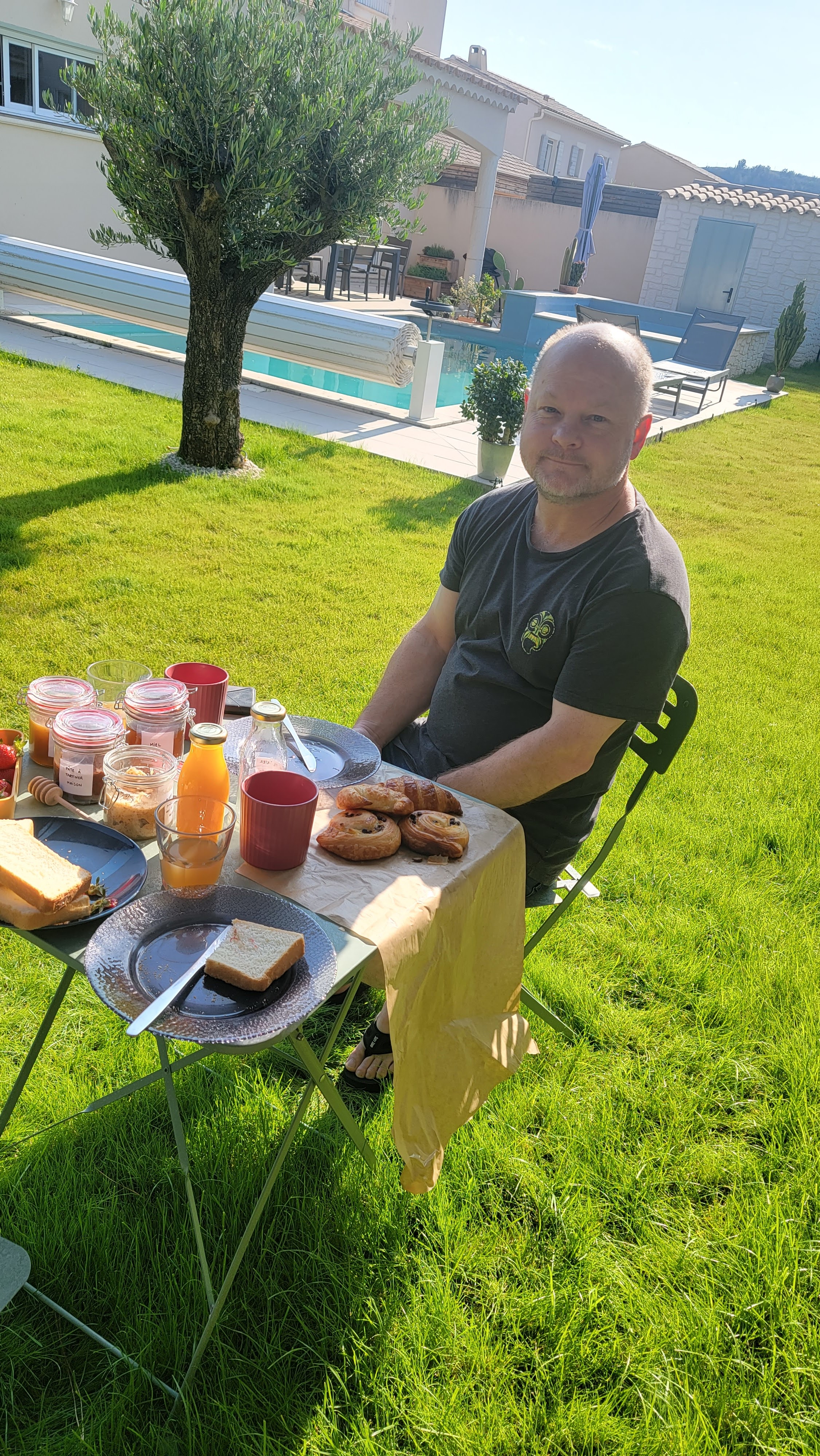 The day that we arrvied in Rochefort-du-Gard, I wrote about our hosts Ce’lestine and Gautier, and how Gautier was studying to become a baker. One of the services Gautier offers here is a breakfast of pastries that he makes himself. We decided to order the breakfast for this morning. We were expecting a couple of pastries and perhaps a beverage. At 8:30am Ce’lestine arrived outside our door with a box. “Good morning. Be careful, it’s heavy. Everything is homemade. Enjoy”.