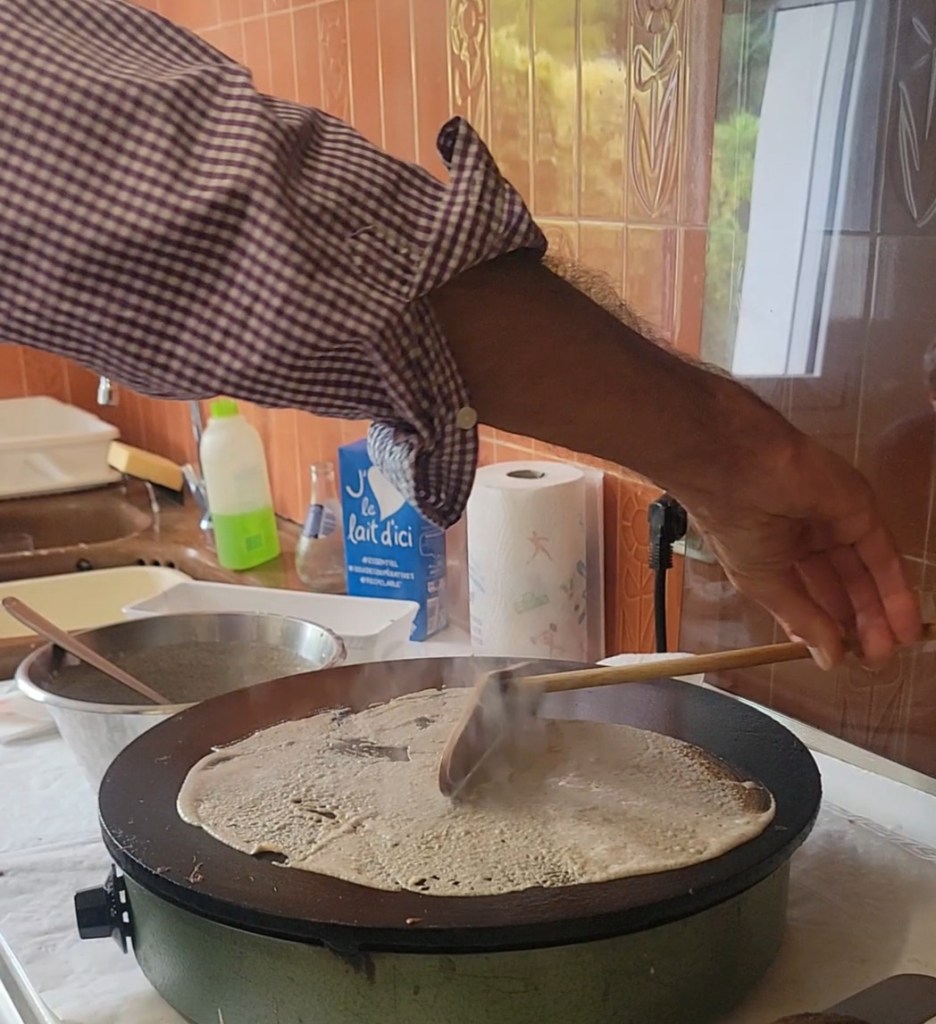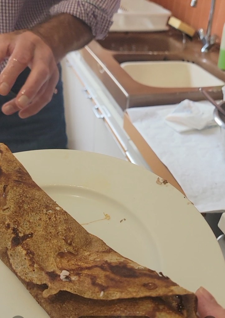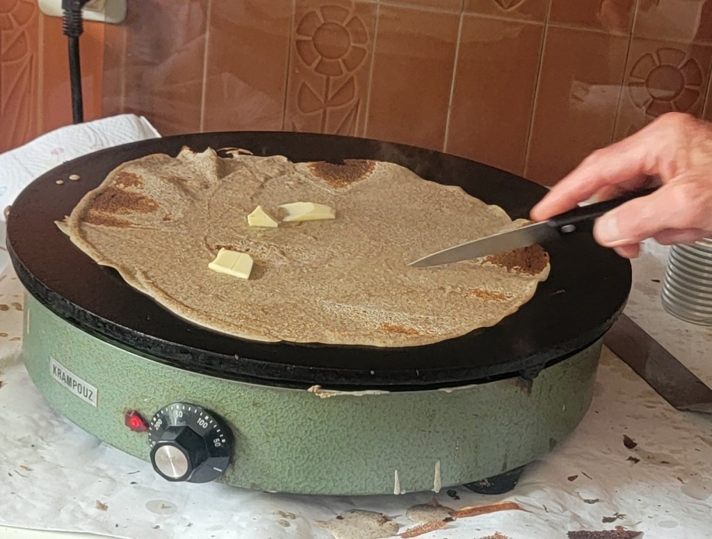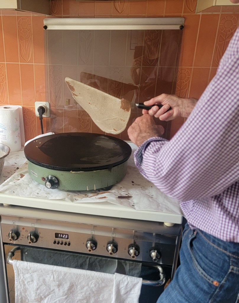 Not long after I arrived, Madame had her neighbour over for morning coffee. Monsieur Voisin has lived in the house next door for many years. The house was built by his parents. In France, the law dictates that a person’s estate must be passed down to their children and divided equally. This can be both a blessing and a curse. But one of the blessings for ME was that Monsieur Voisin is a master crêpe-maker. Ah mais non, Madame tells me that I shouldn’t refer to them as crêpes, but rather les galettes bretonnes.